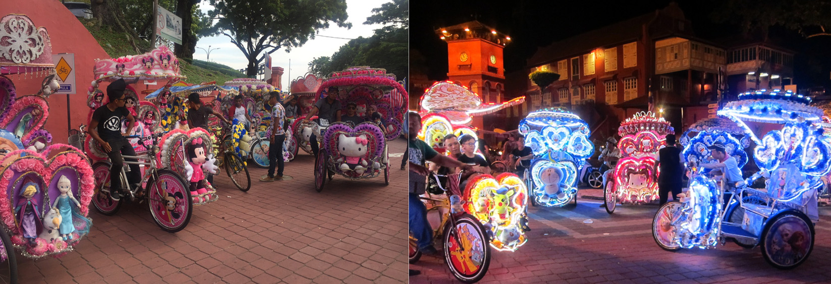 trishaws_Melaka_IMG_3600 Published September 22, 2017 at 1647 × 563 Trishaws by day and by night. // Populares Triciclos de Melaka.. versiones diurna y nocturna.